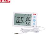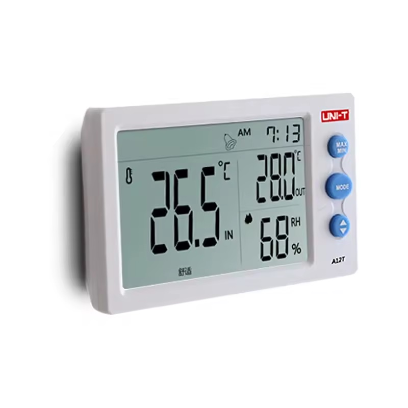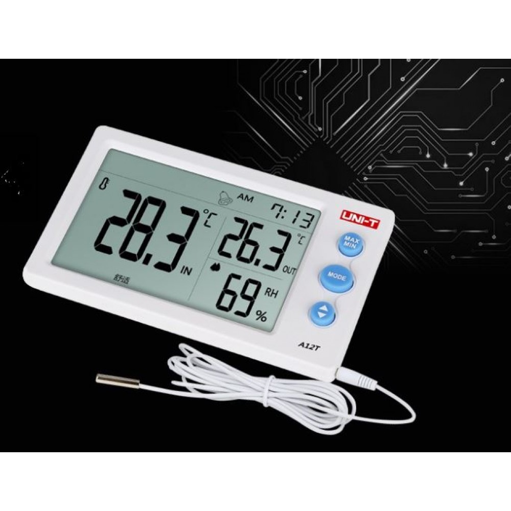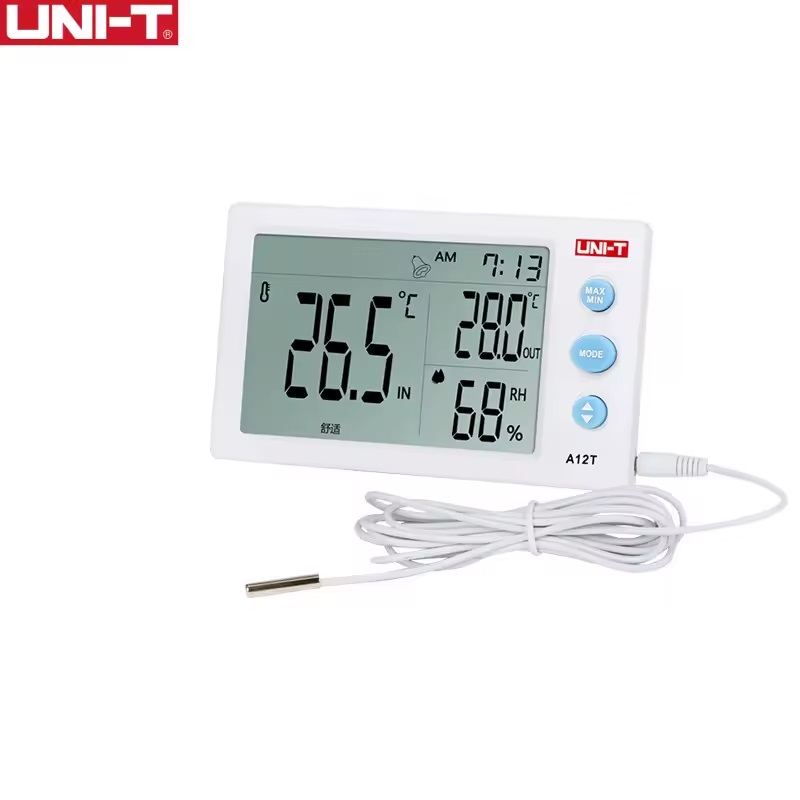 A12T UNI-T دما و رطوبت را به صورت همزمان اندازهگیری کرده و نتایج را روی نمایشگر بزرگ خود، نشان میدهد. میتوان از آن برای محیطهای سربسته و باز استفاده کرد. A12T UNI-T دارای یک حسگر خارجی است و می توان برای اندازهگیری همزمان دمای دو مکان از آن استفاده کرد.