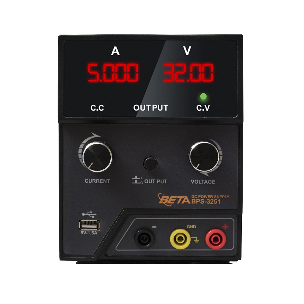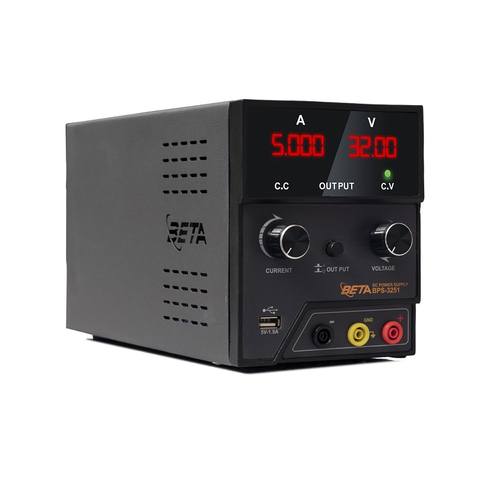منبع تغذیه ترانسی (خطی) BETA مدل BPS-L3251 یک منبع تغذیه DC تک کاناله با بیشینه ولتاژ و جریان خروجی 32 ولت/5 آمپر و بیشینه توان خروجی 160 وات است. این منبع تغذیه دارای یک صفحه نمایش چهار رقمی برای نمایش ولتاژ و جریان است و همچنین دارای دکمه OUTPUT مجزا است.