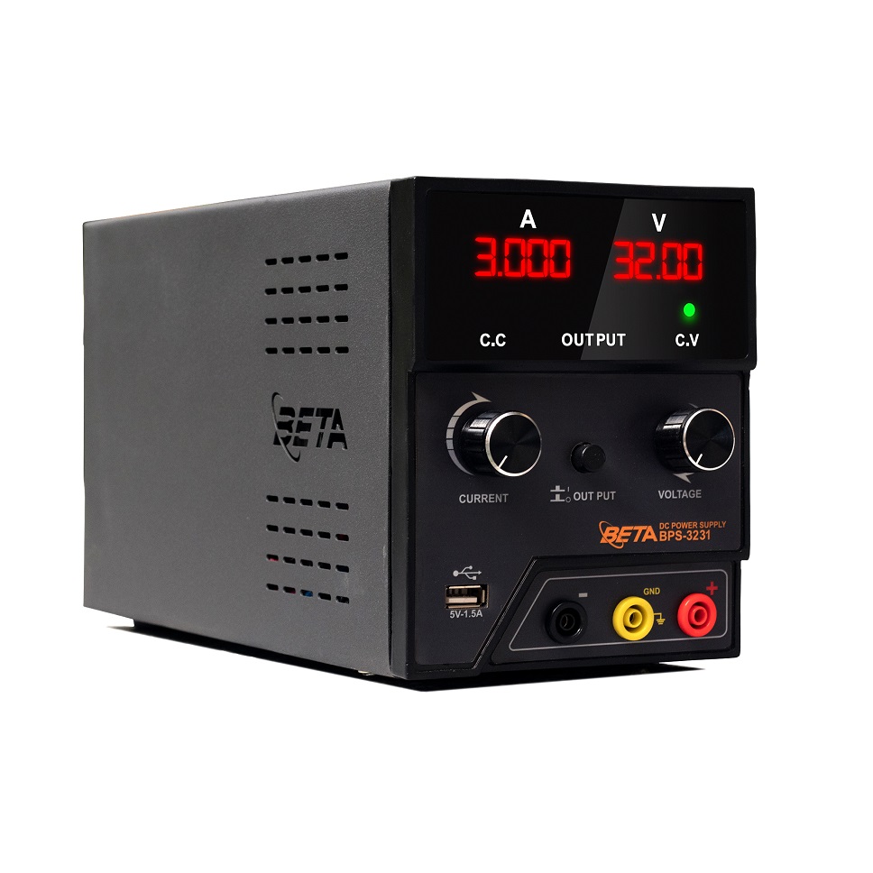 منبع تغذیه ترانسی (خطی) BETA مدل BPS-L3231 یک منبع تغذیه DC تک کاناله با بیشینه ولتاژ و جریان خروجی 32 ولت/3 آمپر و بیشینه توان خروجی 96 وات است. این منبع تغذیه دارای یک صفحه نمایش چهار رقمی برای نمایش ولتاژ و جریان است و همچنین دارای دکمه OUTPUT مجزا است.