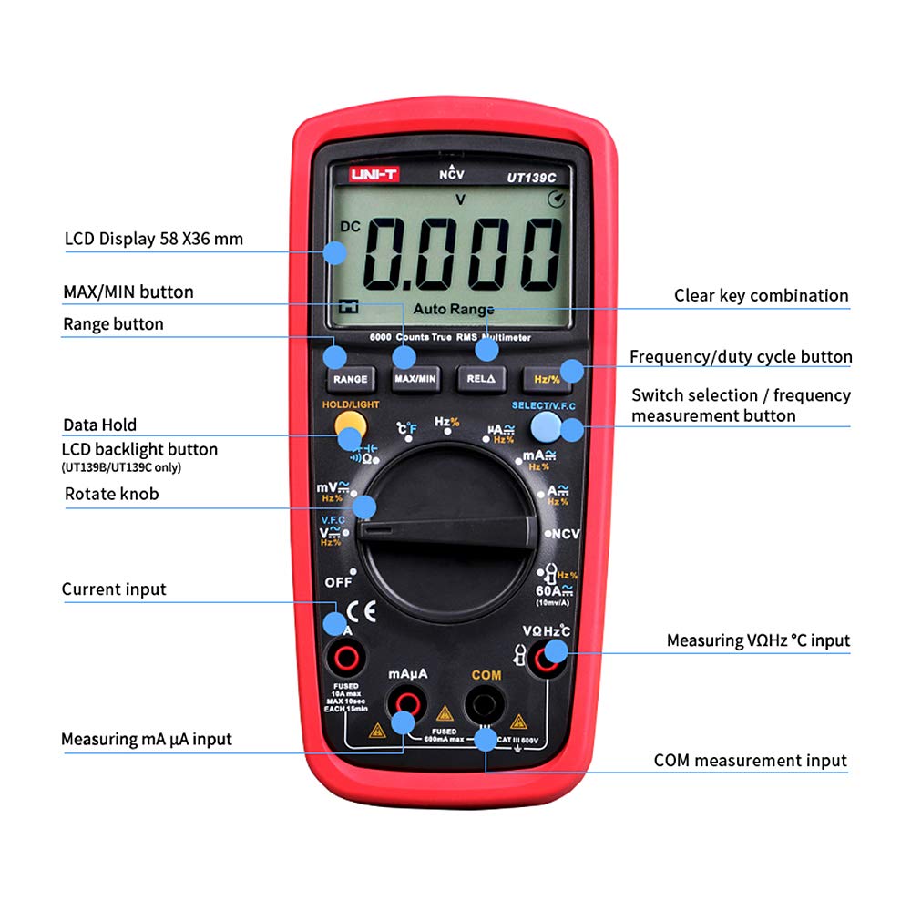 مولتیمتر دستی یونی تی UT139C یک مولتی‌متر دیجیتال پرکاربرد و محبوب است که برای استفاده‌های عمومی و نیمه‌حرفه‌ای طراحی شده است. این مدل ویژگی‌های خوبی دارد و برای بسیاری از کاربردهای الکترونیکی و برقی مناسب است. در زیر به بررسی ویژگی‌ها و مشخصات فنی آن می‌پردازیم: